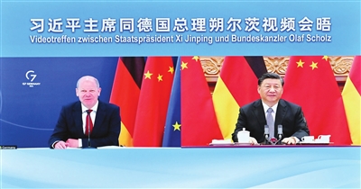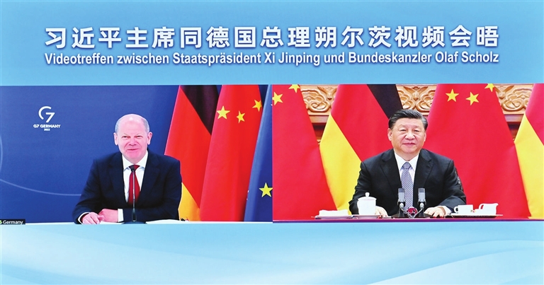 习近平强调,过去50年来,中德关系保持高水平运行,双方通过持续深化务实合作实现了共同发展、相互成就,关键是坚持相互尊重、合作共赢,这一宝贵经验和重要原则要始终如一坚持下去。中方发展中德关系的初衷不变,同德方加强合作的真诚愿望不变,对中德共同办成更多有意义大事的信心不变。双方应该坚持对话合作主基调,用好双边对话合作机制,在应对气候变化、宏观经济政策、金融稳定、能源安全、粮食安全、产业链供应链稳定等各领域开展对话,不断丰富中德关系内涵。要深挖互利合作潜力,积极拓展绿色环保、服务贸易、人工智能、数字化等新技术领域合作。中国加快构建新发展格局,将为包括德国在内的各国提供更广阔市场机遇。要倡导真正的多边主义,维护国际公平正义,携手维护联合国在国际事务中的核心地位,维护国际关系基本准则,推进建设开放型世界经济,促进全球平衡、协调、包容发展。欢迎德方积极支持和参与全球发展倡议和全球安全倡议,推动构建人类命运共同体。