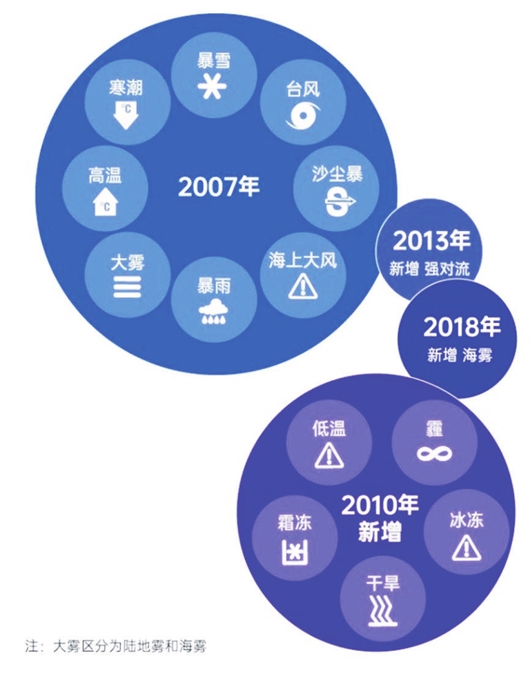 2007年,中国气象局制定并发布《中央气象台气象灾害警报发布办法(试行)》,适用于8类气象灾害预警;2010年,气象灾害预警增至13类;2013年新增强对流预警发布办法,至此气象灾害预警增至14类。2018年,在大雾气象灾害预警中还新增了海雾预警发布办法。