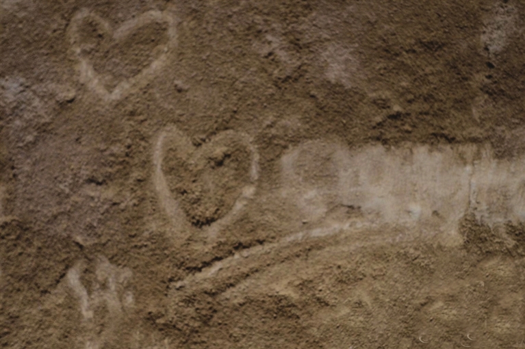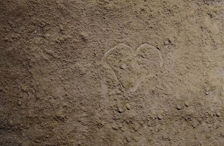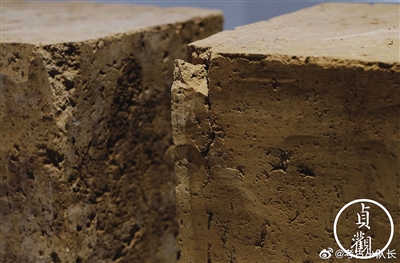 从网友发布的图片中可以看到,陕西考古博物馆一楼展厅内陈列着一些切成立方体的土块,土块上存在明显的缺角、开裂以及人为划痕。另一件西汉时期的彩绘漆箱复原品上,也有触摸后留下的指纹印。更荒唐的是,馆内的千年地裂喷砂遗迹,竟然成了某些人的“告白墙”,上面满是爱心之类的涂划痕迹。