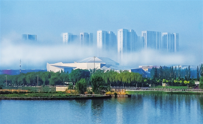 5月13日,长风商务区出现平流雾现象。建筑在云雾中若隐若现,宛如仙境。 徐浩轩 汤柏铭 摄