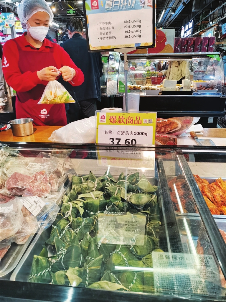 5月14日上午,记者在美特好超市看到,食品区已经开始销售散装粽子,每个1.8元。“这是手工包的粽子,现在只有红枣江米一种口味。”导购员告诉记者,现在每天的两大盆粽子早早卖完。“想吃特别口味的,还得再等一段时间,月底种类比较多。”“超市刚开始卖,我就买来尝鲜,已经来好几回了。”家住北张小区的白阿姨说,她喜欢手工包的粽子,口感好,“以前是自己包粽子吃,但现在不跟子女住一起,包多了吃不了,包少了不划算,想吃就在这里买两个,很方便的。”