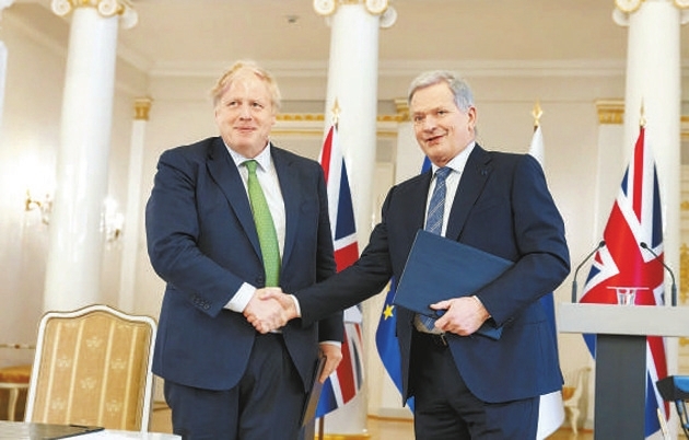 英国首相鲍里斯·约翰逊11日说,英国已同瑞典、芬兰达成新协议,承诺在瑞芬两国武装部队受到攻击时提供支援,以增进“欧洲安全”。根据协议,英国与瑞芬两国将加强新技术和情报收集方面的合作。约翰逊说,英国将应对方请求加强在北欧地区的军事部署,包括扩充陆海空三军设施和人员。上图为5月11日,芬兰总统尼尼斯托(右)在赫尔辛基与到访的英国首相约翰逊握手。