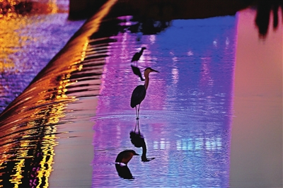 5月15日,夕阳下的汾河景区波光潋滟,几只鹭鸟在霓虹灯的映衬下翩翩起舞,一幅美丽和谐的生态画卷入目而来。 记者 米国伟 摄