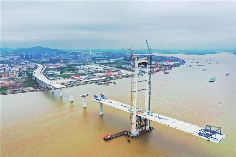 深中通道是集“桥、岛、隧、水下互通”于一体的超大型跨海集群工程,全长约24公里,其中桥梁工程长约17公里,共需架设钢箱梁138片、混凝土箱梁155片,计划今年10月完成全部混凝土箱梁的预制,为深中通道2024年建成通车奠定基础。 新华社 发