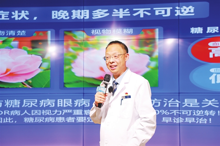 “糖尿病性视网膜病变有什么症状?”“糖尿病患者应多久到眼科检查一次?”这是现场和直播间观众关注较多的两个问题。张东昌教授解释说,糖尿病患者即使血糖控制平稳,其他指标均正常,也不能完全阻止糖尿病视网膜病变的发生和发展,甚至随着病程进展,糖网患者会逐渐出现视物模糊、有黑影、视物变形、直至完全失明。糖网防治的关键在于早检查、早发现、早治疗,糖尿病患者都有患糖网的可能。所以说,只要是确诊为糖尿病的患者,不论糖尿病的类型,都要注意预防。首先,糖尿病患者要做到控制血糖指标,每天测血糖。另外绝对不能忽略的是,患者从确诊糖尿病的那天起就应该尽快进行眼底检查,并遵医嘱定期检查眼底,在有需要的时候尽快接受专业、规范的治疗,这样才能最大限度的帮助患者远离失明的风险。