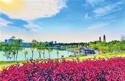 5月23日,初夏的双塔公园“层林尽染”,水天一色,为人们呈现出一幅和谐的生态画图。记者 宿晓健 摄