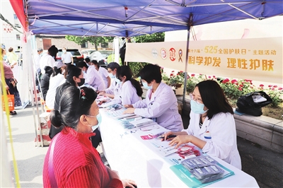 5月25日,山医大一院皮肤科开展“5·25全国护肤日”宣传活动,医务人员向市民发放宣传手册,普及健康护肤常识。 张昊宇 摄