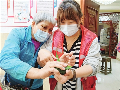 看到黄小米粽子,84岁的徐志英老人连称“想起了小时候的味道”。而祖籍上海的七旬老人苗兰贞则熟练地包起肉粽,她笑眯眯地说:“上海人爱吃肉粽,这是我的拿手绝技呀!”老人们还现场教年轻人包粽子。“我连着包了5个粽子了,越包越熟练,回家了可以给儿子包,让儿子感受妈妈的味道!”34岁的李雯雯很有成就感。