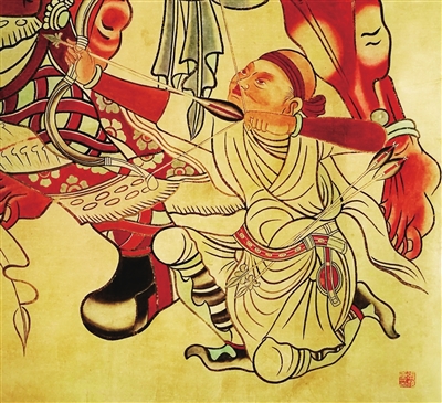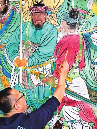 壁画通常篇幅巨大,作画流程相对繁琐。制作泥底、勾勒墨线、渲染补图……每一环节都考验着创作者的耐力与细致。其中一项精细活儿便是着色,行话叫“成活儿”。根据主题和情节的需要确定色调,之后以矿物颜料、工笔重彩技法绘制。