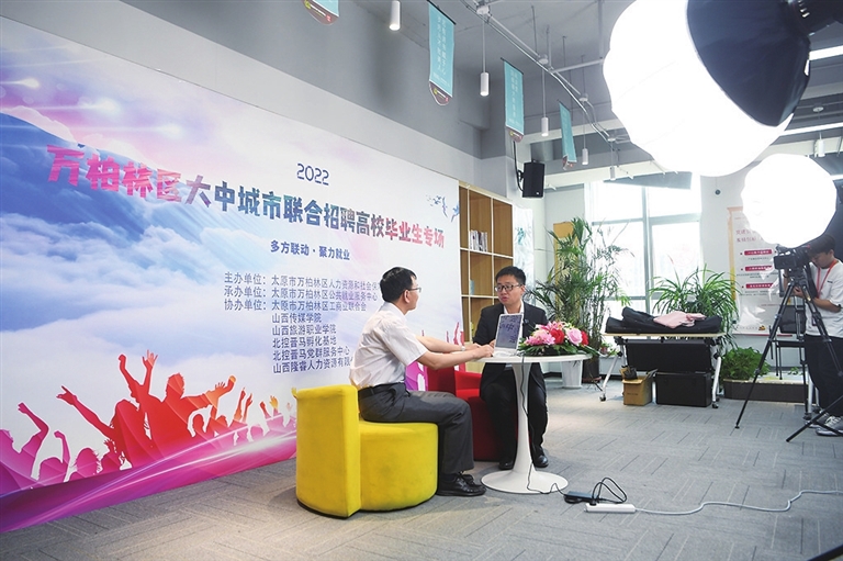 5月27日,由万柏林区人力资源和社会资源保障局主办的2022万柏林区大中城市联合招聘高校毕业生专场会在万柏林国际商务中心进行网络直播。本次活动通过网络平台,让14家企业与两所高校实现联动,有力推动了大学生就业。 张昊宇 摄