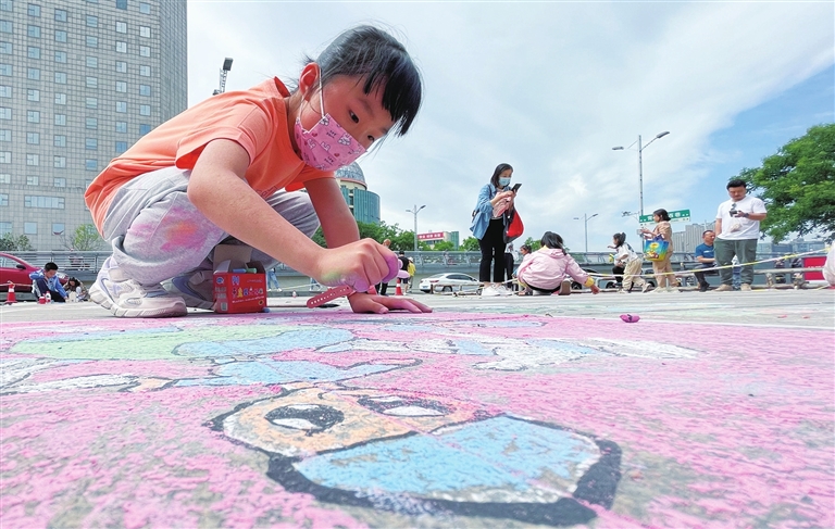 5月29日,太原市青少年宫举办儿童马路粉笔画活动,迎接“六一”国际儿童节的到来。孩子们用手中的粉笔,描绘出心中的梦想和对家乡的热爱。 记者 邓寅明 摄