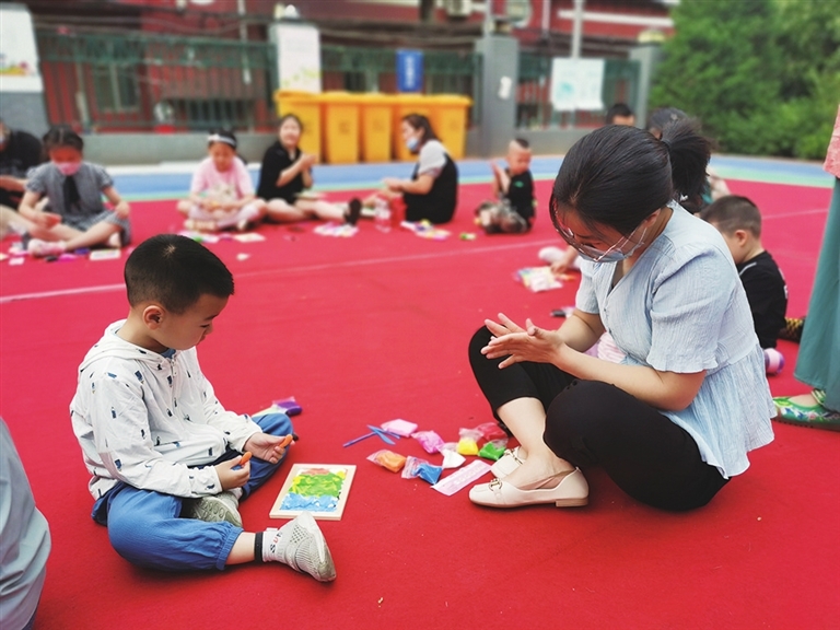 当天的活动在社区小花园举行,孩子们领到颜色缤纷的黏土后,便开始以“童年之花”为主题创作。揉、捏、搓、贴……在家长的陪伴下,孩子们在画框里制作出各具特色的“小花园”。