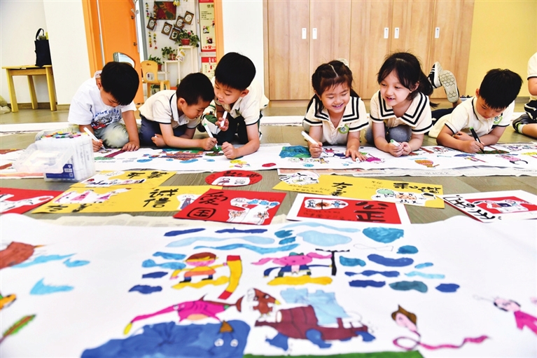 5月30日,在山东省实验幼儿园,孩子们在手绘《西游记》图画。