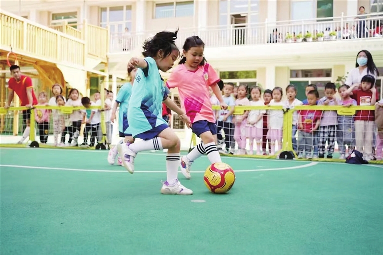 “加油,加油……”稚嫩的童声在育蕾足球场响起,育蕾幼儿园的足球小将们怀着喜悦的心情和足球教练们相约足球场,为全园小朋友奉献了一场精彩的阳光足球表演赛。孩子们在赛场上身姿矫健,传球精准,配合巧妙,展示出了蓬勃的生命力。主题画展上,孩子们用五彩的画笔描绘出美好生活,畅想中国未来的模样。依托园内户外环境,幼儿园通过精巧的空间设置,打造出了艺术文化广场,集中展示了孩子们的画作,将孩子们沐浴党恩、茁壮成长的图景呈现在眼前。在“听爷爷讲过去的故事”环节中,幼儿园邀请了晋剧表演艺术家武凌云为小朋友们讲述党的故事,同时讲解晋剧有趣的文化。