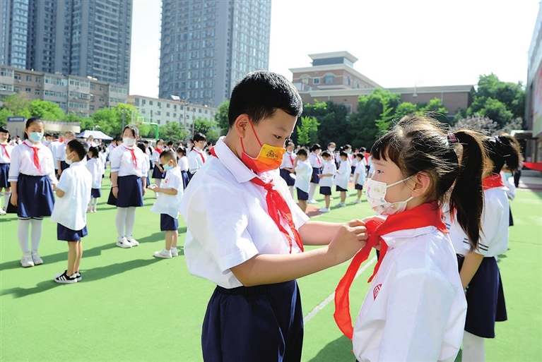 5月31日,迎泽区双西小学举行庆“六一”主题队日活动暨入队仪式。现场,老师和老队员们为新队员戴上了鲜艳的红领巾。 牛利敏 摄