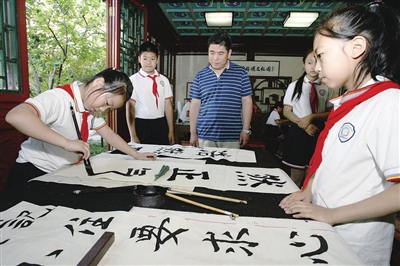 2014年5月30日,在北京市海淀区民族小学的书法课堂,书法老师请习近平总书记为“中国梦”点上最后一笔。总书记对孩子们说,中国梦要靠你们来实现。“两个一百年”要靠你们接力奋斗,还是你们来点这一笔吧。