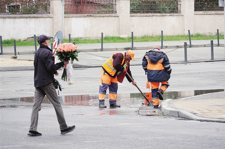 5月30日,乌克兰基辅市政人员清理路面积水,一名手捧鲜花的男子从旁走过。
