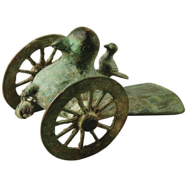 该石分上下两部分,上部左侧端坐于榻上者应为墓主许阿瞿,身后立一执便面的僮仆。榻前有3个儿童,中间一人牵鸠车似乎在奔跑。据墓志铭记载,许阿瞿卒于东汉建宁三年,即公元170年,殁时父母非常悲痛,为他勒石造冢。从画像石中的图像来看,鸠车的主要造型特征是在鸠鸟的身体两侧装上车轮,成为一种可供儿童牵引游戏的车辆玩具。在河南新郑博物馆藏有一件东汉铜鸠车,整体为一鸠,昂首翘尾,两爪处安有两个轮子,鸠背上站有一只调皮的雏鸠,十分形象可爱。