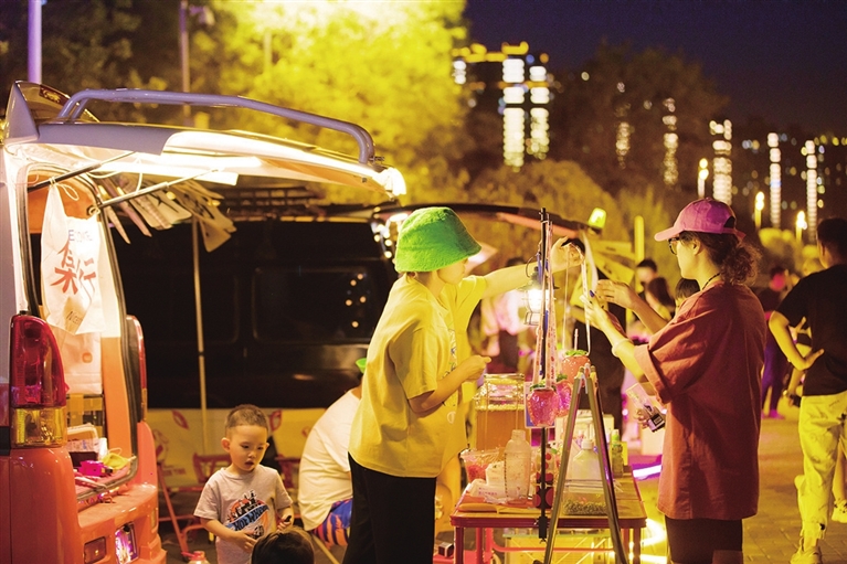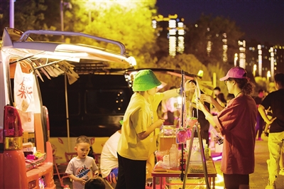 6月1日,汾河景区祥云桥附近,市民自发形成的“后备箱夜市”悄然兴起,个性十足的文创产品、网红食品等受到市民热捧。 王韵菲 摄