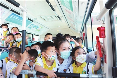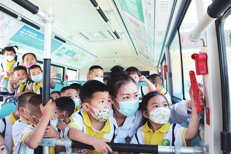 | 6月1日,杏花岭区小星星幼儿园的小朋友走进市公交集团四公司参观。在工作人员的带领下,孩子们与公交零距离“亲密接触”,学习安全乘车知识。 张昊宇 摄 |