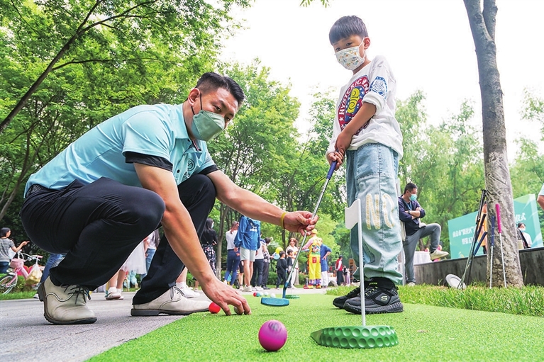 小朋友体验“迷你高尔夫”项目。