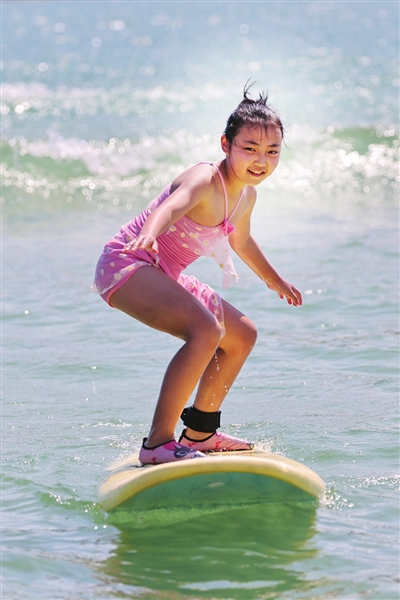 小朋友在海南三亚皇后湾海域体验冲浪运动。