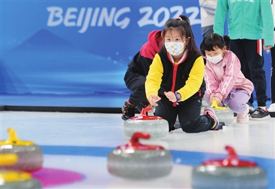 小朋友在体验冰壶运动。