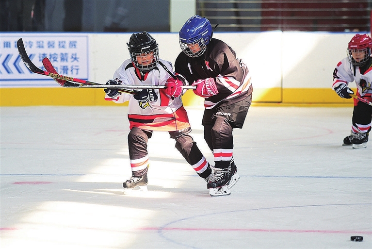 少年冰球爱好者们进行冰球对抗赛。 新华社 发