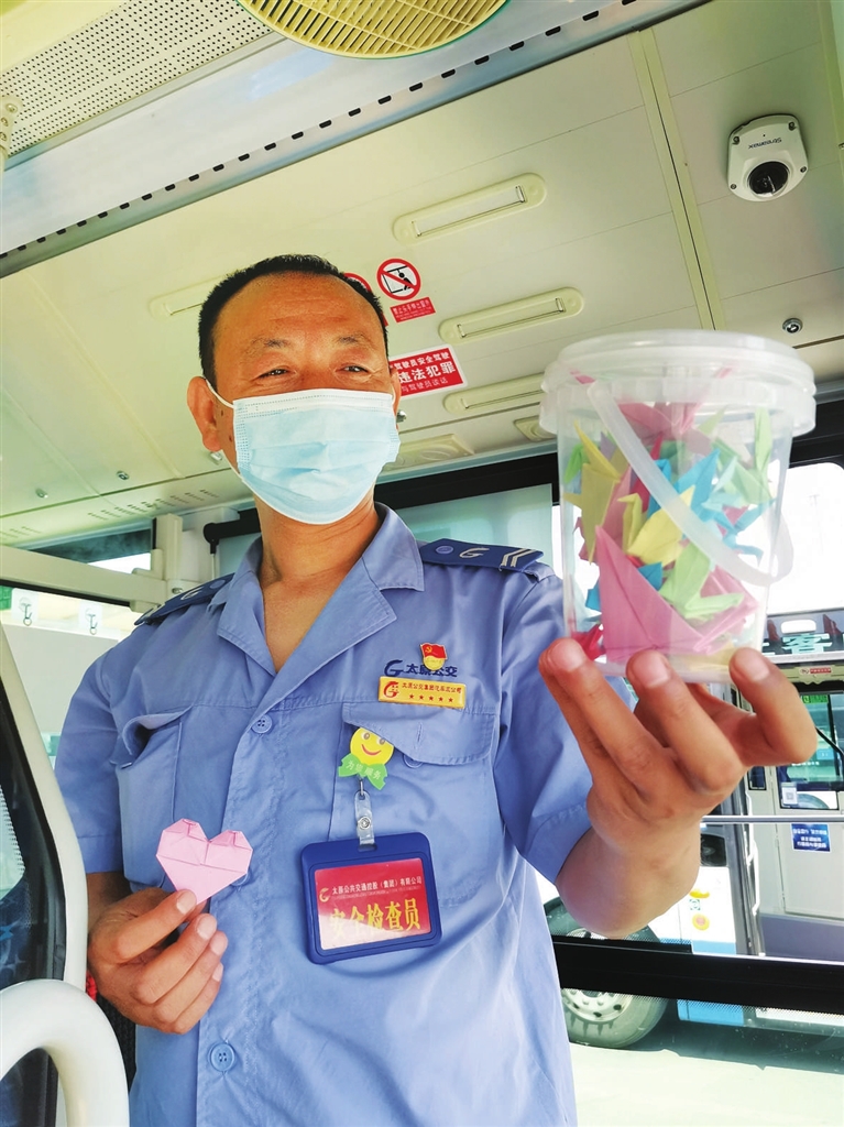 下午3时许,同事张蓉将一个透明小圆桶递给苏毅,里面装满了千纸鹤。张蓉说,刚才遇到一名女士,让把这桶千纸鹤转交给619路34229号车的司机师傅。苏毅打开查看,里面还有一张纸条,上面写着:“谢谢您,好心的司机叔叔。您的祝福语让我平复了心情,您的小笑话令我化解了焦虑。我轻松上阵,第一门语文自我感觉良好,我委托母亲把我平日折叠的千纸鹤送给您,也愿您天天都有好心情。”