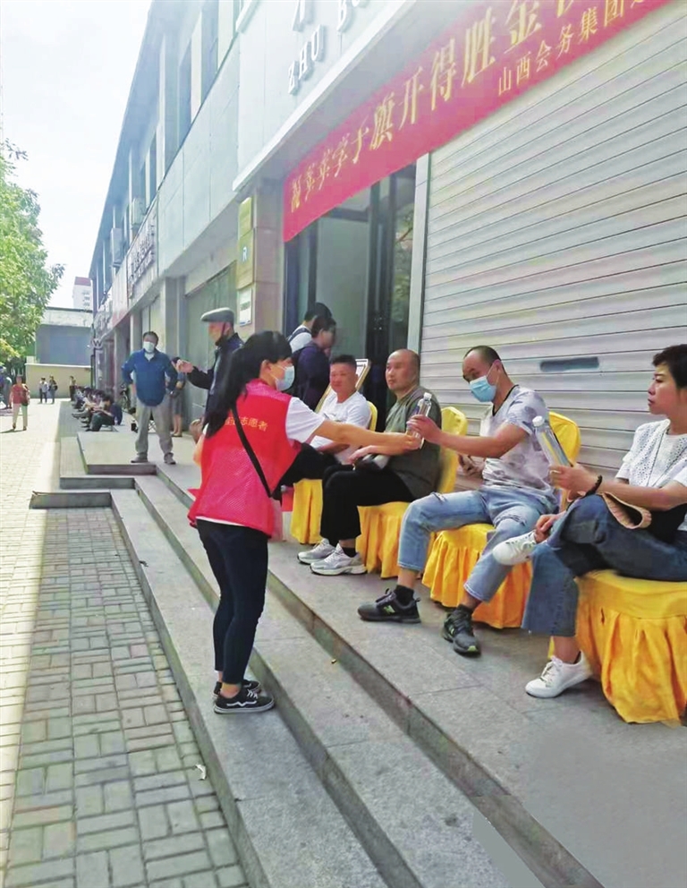 高考首日上午10时许,成成中学考点外站满等待的家长。海东社区和铁匠巷社区的工作人员、志愿者,在成成中学门口设立服务台,为考生家长提供矿泉水、免费口罩和扇子等,并在学校对面设有休息室,并备好绿豆汤、菊花茶等消暑饮品。附近商家也将自家的椅子摆在门口便道上供考生家长休息,共同为家长们送去“清凉”。 郭晓华 刘丽 张玉洁 摄