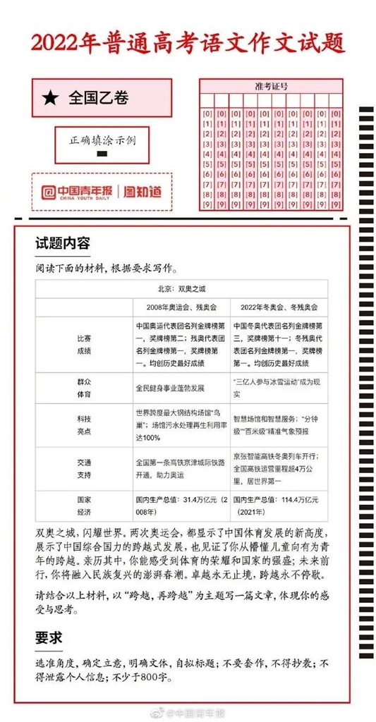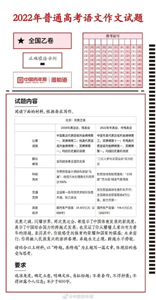 高考语文命题组专家表示,全国乙卷作文围绕“双奥之城”组织信息,以表格和数据的形式,直观呈现我国综合国力的跨越式发展,激发爱国热情,引导学生体会冬奥精神的深刻内涵。