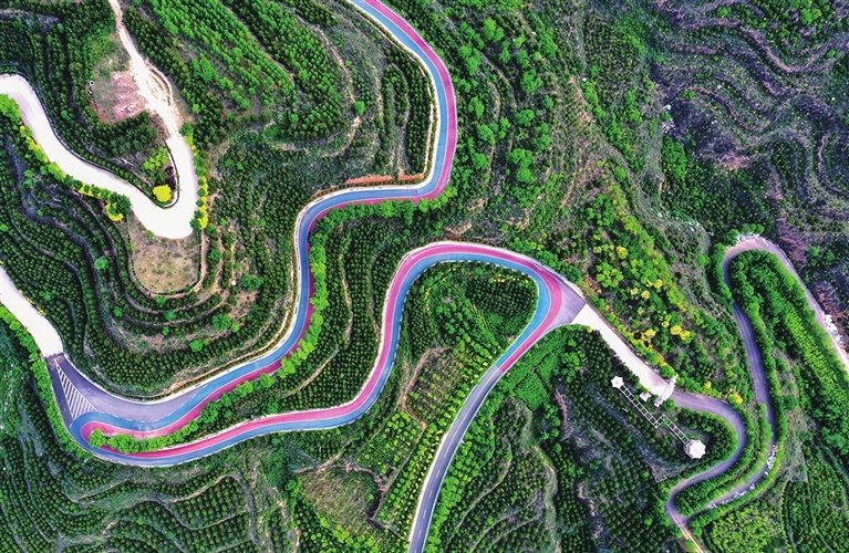 6月9日,东山层层叠叠的绿色植被被旅游公路如彩带般串联在一起。东山环境治理总面积达到了3850亩,大力引入阔叶树种、彩叶树种、经济树种,实现一次造林、一次成林、一次成景。 记者 韩双喜 摄
