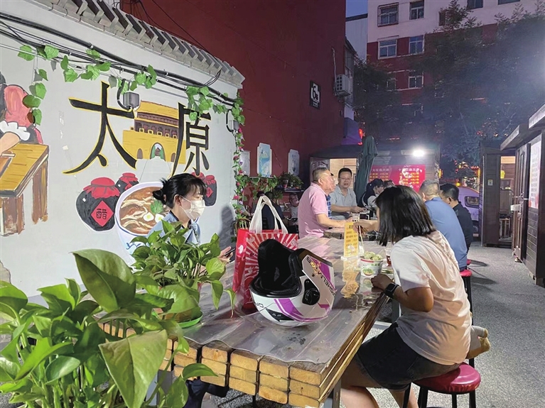 一入古街,人声鼎沸,酒旗翻飞。经过统一的设计打造,街道两侧店铺家家青砖为墙,朱漆门窗,重檐飞角中,一派古色古香的旧时模样。上马街历史绵长,街上特色美食也广为老太原人熟悉。街口是路人必吃的老天津包子铺,刚出锅的包子洁白暄软、肉香扑鼻,往来者凡闻到这个味儿,看也不用看,就知道是上马街了。“一份天津包子、一份地皮菜包子。”“好嘞,冯老哥!”小小的窗口前,都是熟络的老顾客。