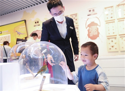 6月9日,一名儿童在“24小时博物馆”讲解员的介绍下了解鸟类标本。