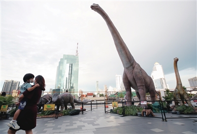 6月8日,在泰国首都曼谷,人们观看机器恐龙模型。