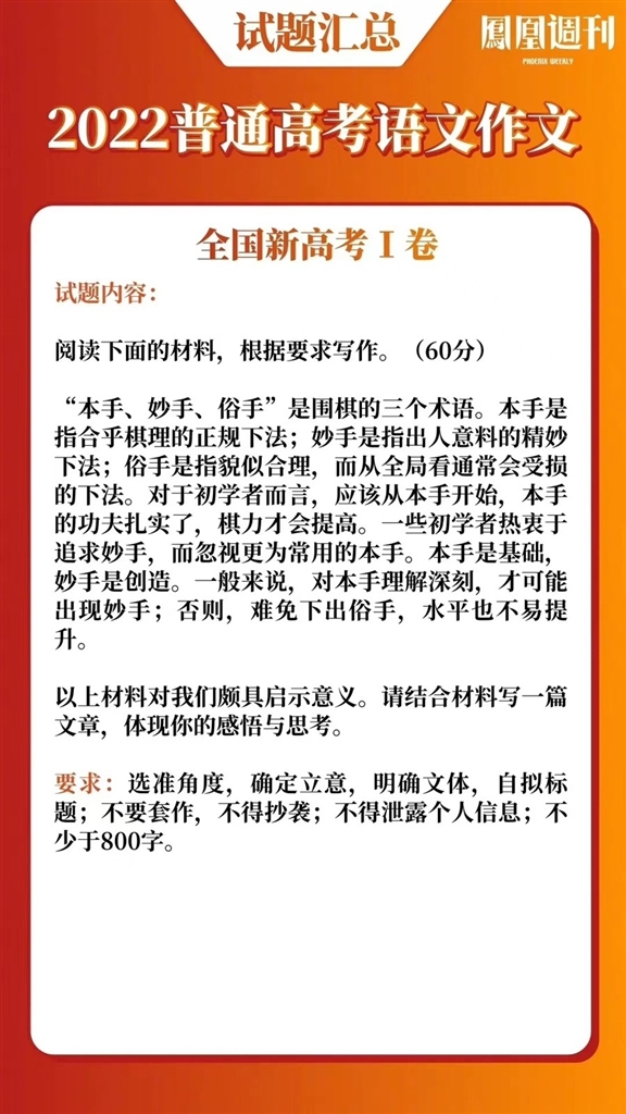 在今年的作文题材料中这样写道:“本手、妙手、俗手是围棋的三个术语。本手是指合乎棋理的正规下法;妙手是指出人意料的精妙下法;俗手是指貌似合理,而从全局看通常会受损的下法。对于初学者而言,应该从本手开始,本手的功夫扎实了,棋力才会提高。一些初学者热衷于追求妙手,而忽视更为常用的本手。本手是基础,妙手是创造。一般来说,对本手理解深刻,才可能出现妙手;否则,难免下出俗手,水平也不易提升。”