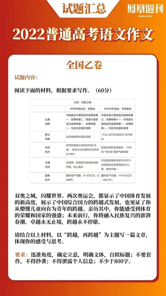 语文考试结束,内蒙古呼和浩特市第九中学的班级群里就有很多学生对作文进行了讨论。“‘跨越,再跨越’题目与冬奥会、双奥有关,从考试的角度而言还是比较好写的,以体育、科技等所取得的成绩作为切入点,谈国家的变化。”该校语文老师薛锋表示,“有的学生因为自身兴趣爱好,对体育的事掌握比较多,看到这份试卷作答时就不会心慌,会很有底气,也会缓解一些考试的焦虑情绪。”