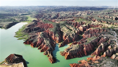 麻黄梁黄土地质公园风光(6月10日摄,无人机照片)。 麻黄梁黄土地质公园位于陕西省榆林市榆阳区。夏日里,这里的黄土峰峦、草滩河源、深沟巨壑在蓝天白云下交织相连,天然成趣。 新华社 发