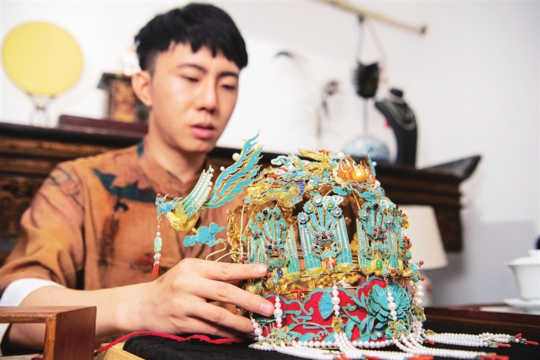 7年前,大学毕业不久的“90后”小伙辜国强偶然接触到花丝镶嵌技艺并迅速爱上了这门古老的手艺。拜师学成后辜国强建立了现在的工作室,开始探索利用这门传统工艺制作适合现代人佩戴的饰品,以创新的手段重塑老技艺,让传统工艺焕发新生机。