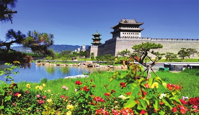 阳光灿烂,碧水环绕,绿树鲜花,远山如黛,高天湛蓝,镝楼巍峨,夏日的太原古县城添了几分妩媚。 杨靳葆 摄