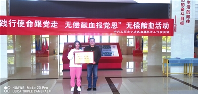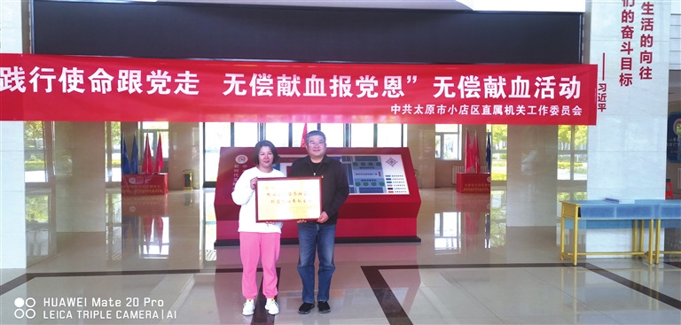 多年来始终将献血工作作为“服务社会,拯救生命”的一项重要任务,无论在本职岗位和社会志愿奉献岗位,十年如一日奉献于献血事业。积极响应区献血办的号召,带领广大志愿者和全区干部职工积极参与无偿献血,推动了小店区无偿献血事业的发展。全区无偿献血合计135431人次,献血量达到5400万毫升。在志愿献血服务活动中,坚持“奉献、友爱、互助、进步”的志愿精神,“要么不做,做了就要做得最好”,这是她的奉献格言。