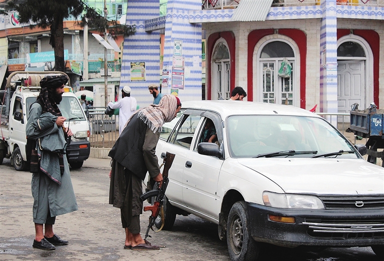 6月12日,在阿富汗库纳尔省首府阿萨达巴德市,塔利班安全人员在爆炸现场附近警戒。 阿富汗库纳尔省警方负责人阿卜杜勒·哈克·哈卡尼12日说,一辆载有阿富汗安全人员的车辆当天在该省首府阿萨达巴德市遭炸弹袭击,造成至少5人受伤。一名现场目击者在接受新华社记者采访时说,这起炸弹袭击造成至少2人死亡、5人受伤。新华社 发