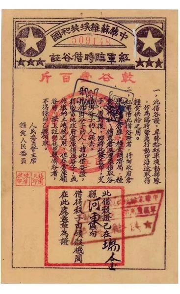 在一枚面值为“干谷壹百斤”的“中华苏维埃共和国红军临时借谷证”前,我们停留下来,倾听它的故事。“随着中国工农红军的不断发展壮大,粮食供给成为苏区政府需要解决的最大问题。革命群众积极响应,宁愿自己节衣缩食,也要借出家中的谷米给红军。这是根据地政府在粮食供应制度上的一个创举。”曾波介绍,“这种红军临时借谷证一直延续使用到1934年年底,是最早出现的粮食实物债券。”