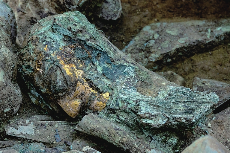 除了今年初已经公布的铜龙,考古学家还发现了金面罩铜头像、顶尊蛇身铜人像、精妙复杂的铜神坛、“机器狗”一样的铜巨型神兽、“裹裙坎肩大背头”的铜立人像、铜猪鼻龙形器、铜戴象牙立人像、铜神殿形器盖、石磬等,其中数件造型奇特的青铜器是考古史上首次发现。