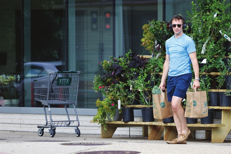 6月14日,在美国华盛顿,一名男子提着购物袋从一家食品超市旁走过。