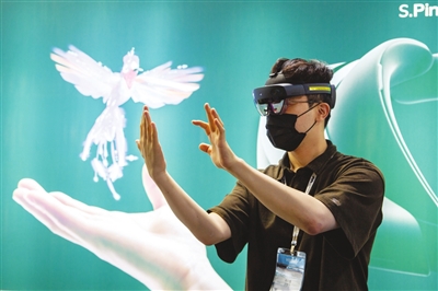 6月15日,参观者在韩国首尔举办的元宇宙博览会上体验混合现实头显设备。