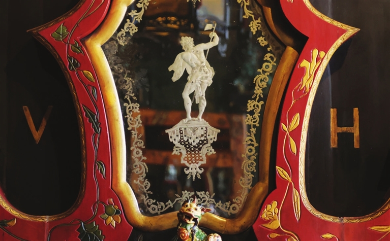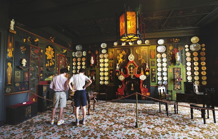 奥迪内介绍说,“中国客厅”房间的装饰,体现了雨果和德鲁埃对中国文化共同的喜爱和欣赏。雨果无论在巴黎还是在流亡根西岛期间,都不断收集中国艺术品。然后,他借鉴“中国元素”装饰德鲁埃的房间。房间内的木刻和漆器上的图案都是雨果本人绘制后,请根西岛的木匠进行雕刻。“雨果受中国家具、瓷器上人物、花鸟图案的启发,借鉴中国艺术的笔触进行再创作,他沉浸在一种中国画家的感觉中。”奥迪内说。