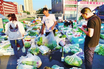 一路向东,至军民路口,画风突变,吆喝声起。拐角处向南延伸,高大的厢式货车绵延几百米,每台车下都是忙绿的身影,搬菜的、记台账的、回答询问的……一箱又一箱各式蔬菜前,电动车来回穿梭,骑车人选好菜品,整捆放置在踏板上,“嗖”的一声开远了。他们大多经营着“小摊摊”,或餐馆,或菜店。那些拎着购物袋低头挑来拣去的,多是附近居民,赶早来,为了一家人的餐食,新鲜而便宜。