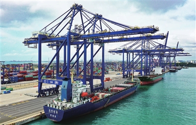 巨轮靠泊,岸桥伸缩,洋浦国际集装箱码头一派繁忙。