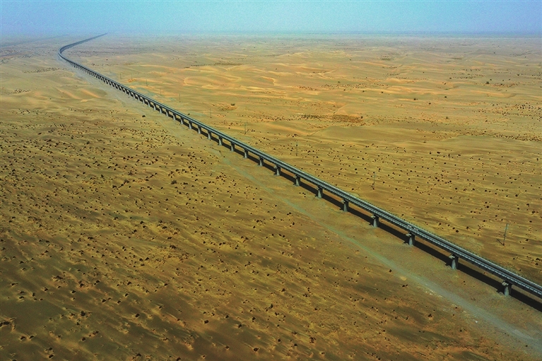 1000多个施工日夜里,建设者在和若铁路沿线共修建草方格近5000万平方米,种植梭梭、红柳、沙棘等灌木和乔木近1300万株,林带覆盖面积超过11万亩。这条长300公里的“绿色走廊”已成为防风沙的屏障。